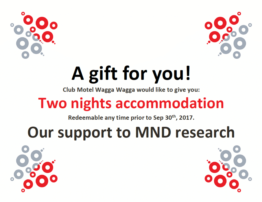 The Globe and our Partner Motel is happy to announce our support for Motor Neurone Disease research by offering a gift for a prize raffle. There will be a lunchon on tomorrow 8/10/2016 which will hope to raise up to $10,000! We wish them all the very best in their worthy cause.
